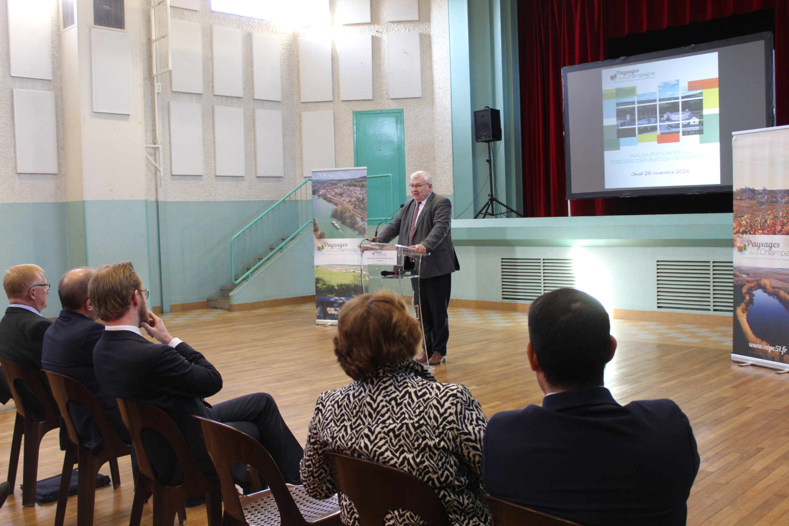 En présence du Sous-Préfet d’Epernay, Emmanuel AUBER, du Député, Maxime MICHELET, du Sénateur, Christian BRUYEN, de Johnathan RODRIGUES (Attaché parlementaire du Sénateur Anne-Sophie ROMAGNY), de la Conseillère départementale, Maryline VUIBLET (représentant Jean-Marc ROZE), ainsi que le Président de la CCPC, Régis COUTANT, du Vice-Président Assainissement, Freddy LECACHEUR et du Maire de la commune de Dormans, Michel COURTEAUX, cette inauguration a rassemblé une 50aine de personnes, en premier lieu à la station d’épuration pour une visite du site et la coupe du ruban, puis à la salle des fêtes de Dormans.